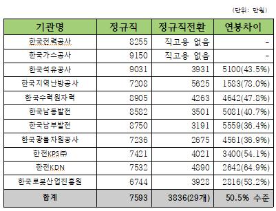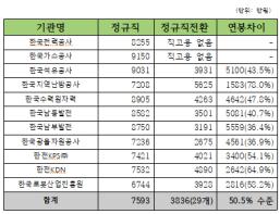 반면 41개 공공기관 일반정규직 직원의 평균 연봉은 7593만원으로, 정규직전환 직원보다 3757만원이나 높았다.