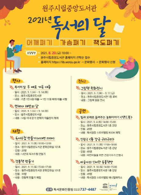 원주시립중앙도서관이 9월 독서의 달을 기념해 독서문화 진흥에 앞장서고자 '어깨펴기 가슴펴기 책도펴기' 라는 슬로건으로 다양한 문화행사를 마련한다.