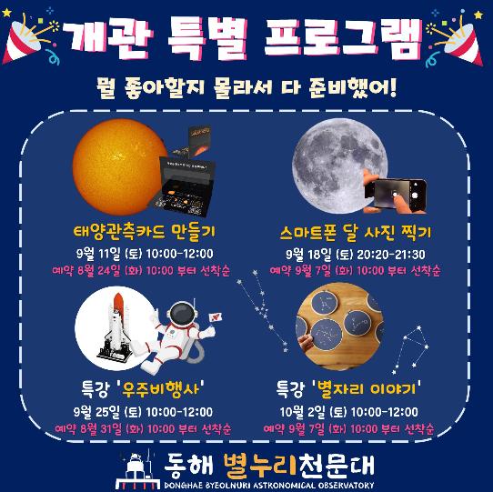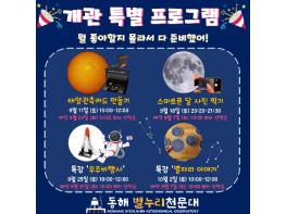 특히, 9월 한 달은 개관을 기념하기 위해 천체 관측 뿐만 아니라 만들기 체험, ‘우주비행사’ 특강 등 다양한 개관 특별 프로그램도 운영한다.