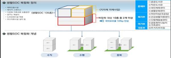 생활SOC 복합화는 그동안 별도의 공간에 각 부처가 관장하는 시설을 각각 만들던 방식에서 벗어나서, 일상생활과 밀접한 체육관, 도서관, 어린이집, 주차장 등 다양한 시설을 한 공간에 모으는 사업이다.