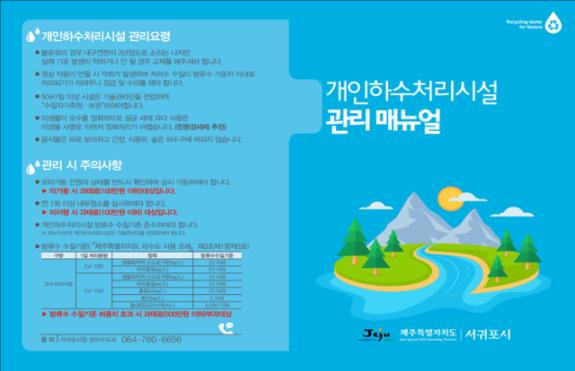 서귀포시 상하수도과는 지하수 오염 방지 및 건축주의 개인하수처리시설 관리에 대한 인식 개선을 위해 위와 같은 내용을 포함한 개인하수처리시설 관리 매뉴얼을 제작하였으며 서귀포시 관내 설치된 모든 시설(4,115개소)에 대하여 배부를 완료하였다.