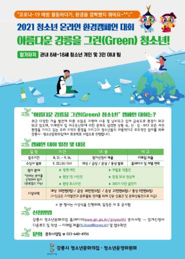 강릉시 청소년문화의집은“아름다운 강릉을 그린(Green) 청소년!”을 주제로 한 2021 청소년 온라인 환경캠페인 대회를 운영한다.
