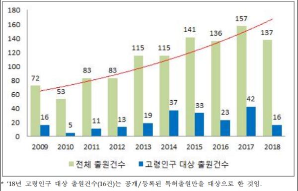 특허청에 따르면, 최근 5년간 재활보조기기의 특허출원은 686건으로, 이전 5년간 출원 건수인 406건에 비해 69% 증가했고, 이 중 고령인구를 대상으로 하는 재활보조기기는 64건에서 151건으로 두 배 이상 급증했다.