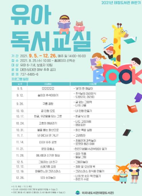 태장도서관은 오는 9월부터 6~7세 유아를 대상으로 ‘2021년 하반기 유아독서교실’을 운영한다.