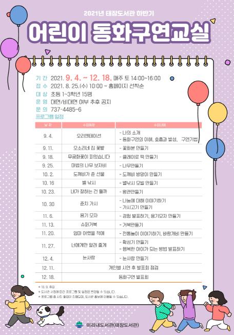 태장도서관은 오는 9월부터 초등 1~3학년을 대상으로 ‘2021년 하반기 어린이 동화구연교실’을 운영한다.
