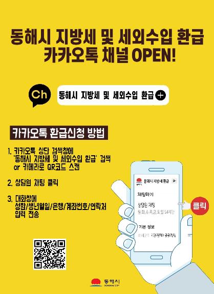 동해시는 이달부터 카카오톡을 이용해 간편하게 지방세와 세외수입 환급금 지급 신청을 할 수 있는 ‘카카오톡 지방세 및 세외수입 환급신청 서비스’를 시작한다고 밝혔다.