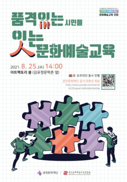 춘천문화재단은 오는 25일 오후 2시부터 문화예술교육 지역화에 따른 포럼 「품격있는 시민을 잇는 문화예술교육」을 아트팩토리 봄에서 개최한다.