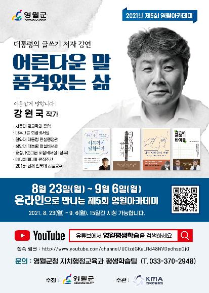 영월군은 8월 23일부터 9월 6일까지 15일간 제5회 영월아카데미를 비대면 온라인 강좌로 진행한다.