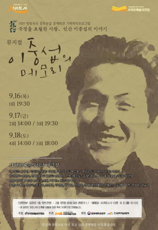 서귀포시는 9월 16일~18일 총 5회 공연으로 화가 이중섭의 이야기를 뮤지컬로 제작한 “이중섭의 메모리” 공연을 서귀포예술의전당 대극장에서 개최한다.