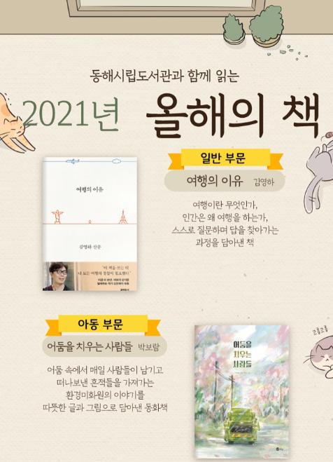 '동해시 올해의 책'으로 선정된 도서는 일반도서 - 김영하 작가의 ‘여행의 이유’, 아동도서 – 박보람 작가의 ‘어둠을 치우는 사람들’이다.
