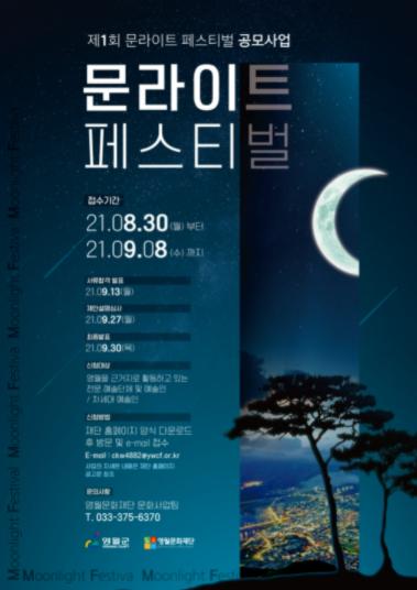 (재)영월문화재단은 문화도시의 발판이 되고자 지역 문화예술단체의 창작활동을 지원하는 ‘제1회 영월 문라이트 페스티벌 공모사업’을 실시한다. 이번 사업은 문화예술 공연 및 전시 등이 취소되어 경제적 어려움을 겪는 영월군 문화예술인들의 예술 활동 단절 방지와 열악한 창작 여건 개선을 위해 추진하고 지역의 청년 및 차세대 예술인을 발굴하고 지원하기 위한 사업이다.