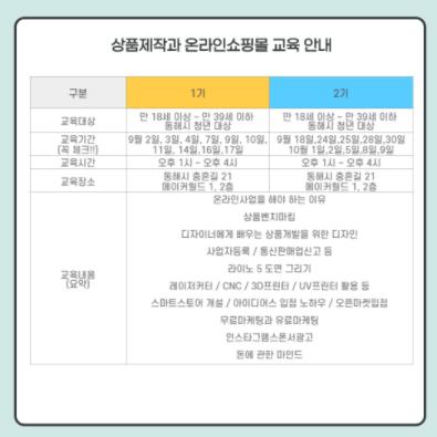 동해시는 청년 창업 확대 및 일자리 창출을 위한 맞춤형 교육 프로그램인 상품제작과 온라인쇼핑몰 교육생을 모집한다고 밝혔다.