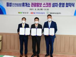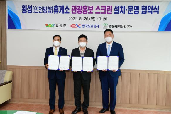 횡성군은 26일 오후 1시 20분, 군수 집무실에서 한국도로공사 및 횡성(인천방향)휴게소 운영사 영동레저산업(주)과 관광 홍보 스크린 설치 운영을 위한 업무협약을 체결하였다.