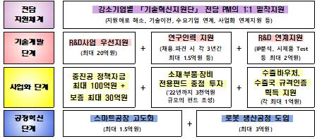 아울러, 지정이후 5년 간 기술개발, 개발기술의 양산·판매, 공정혁신까지 全주기에 걸쳐 강소기업에게 필요한 지원을 패키지로 제공한다.