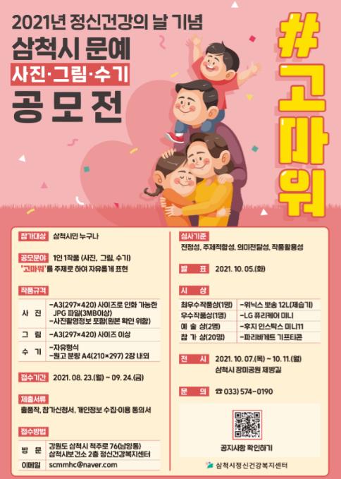 공모기간은 오는 9월 24일(금)까지이며 시민 누구나 ‘#고마워’를 주제로 사진, 그림, 수기로 자유롭게 표현해 삼척시정신건강복지센터에 방문 또는 이메일2) 로 접수하면 된다.