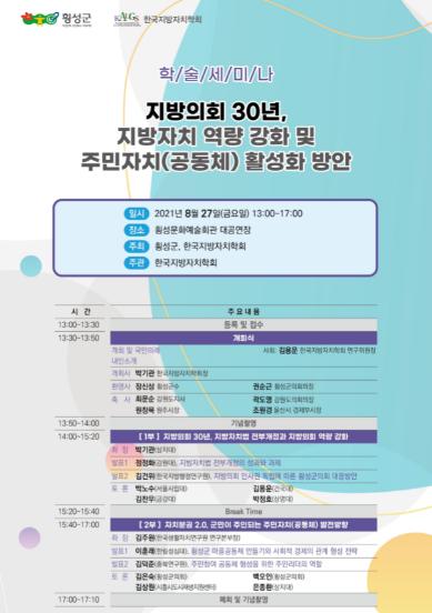 횡성군은 27일 오후 1시 30분, 횡성문화예술회관 대공연장에서 「지방의회 30년, 지방자치 역량강화 및 주민자치 활성화 방안 학술세미나」를 개최한다고 밝혔다.