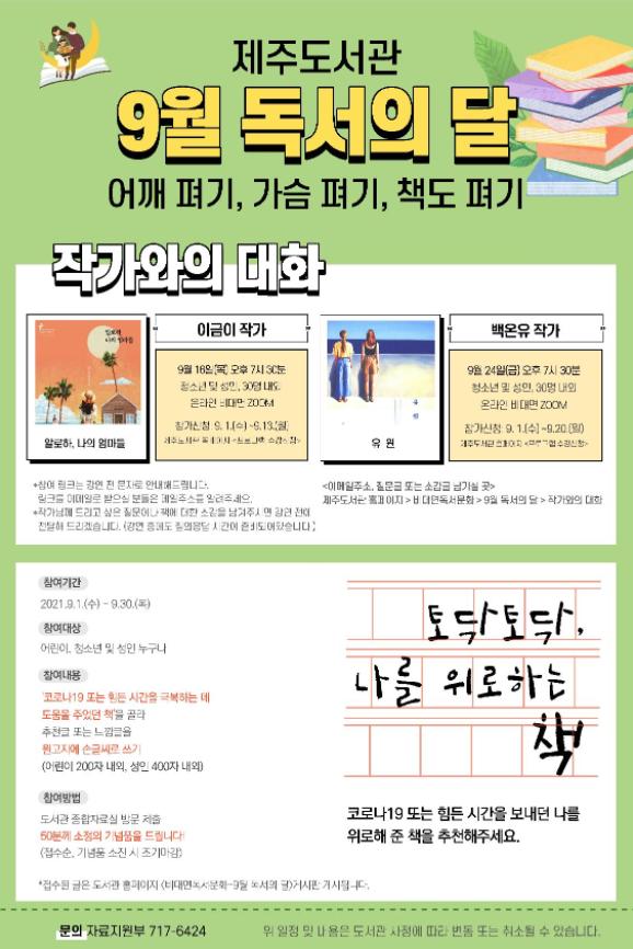 제주도서관은 9월 독서의 달을 맞이하여 지역주민들이 좋은 책을 읽고 쓰고 함께 이야기 나누며 코로나19로 지친 마음을 위로할 수 있는 시간을 마련하다.