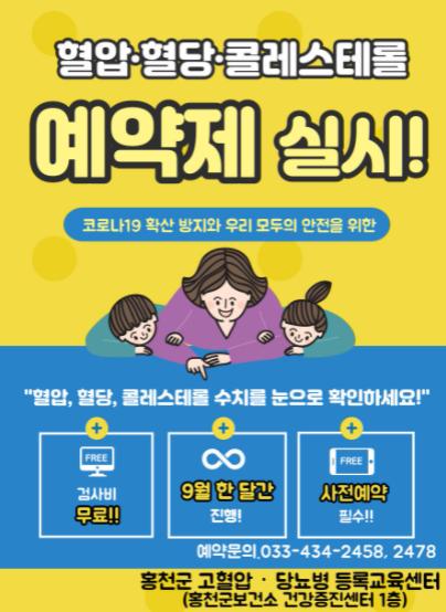 사전 예약제 건강측정에 참여하고자 하는 대상자는 홍천군 고혈압·당뇨병 등록교육센터로 예약한 후 센터를 방문해 혈압·혈당·콜레스테롤 측정검사와 결과에 따른 맞춤형 상담을 받으면 된다.