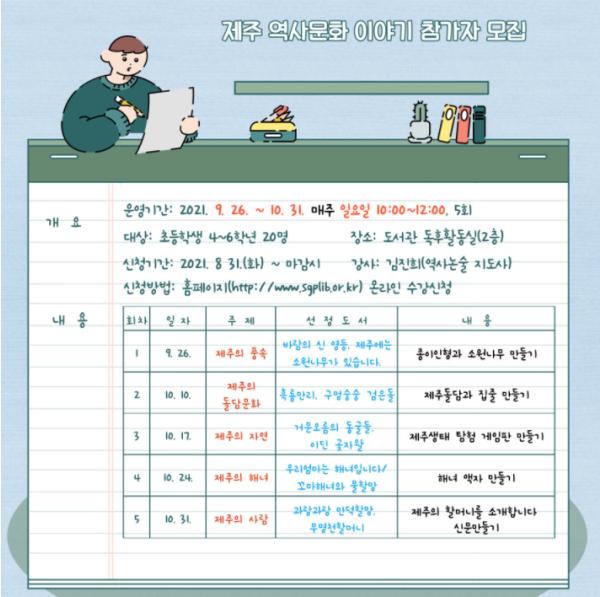 본 프로그램은 초등학생 4~6학년 20명을 대상으로 2021년 9월 26일부터 10월 31일까지 서귀포도서관 독서활동실(2층)에서 오전 10시부터 12시까지 5회에 걸쳐 운영된다.