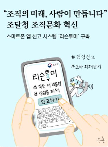 김정우 조달청장은 "리슨투미 도입은 직장 내 괴롭힘·성희롱 예방을 위한 선제적 조치"라며 "앞으로도 따뜻한 조직으로 거듭나기 위한 조직문화 개선 노력을 다할 것"이라고 말했다.