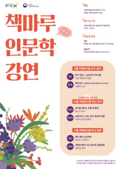 문화재청 국립무형유산원은 「책마루 인문학 강연」 문화프로그램을 오는 9월 7일부터 11월 16일까지 총 6회 실시한다.