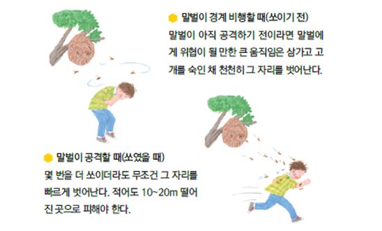하지만, 실수로 벌집 등을 건드려 벌들이 달려들 때는 몇 번을 쏘이더라도 무조건 그 자리를 벗어나 20m 정도 떨어진 곳으로 대피하여야 한다.