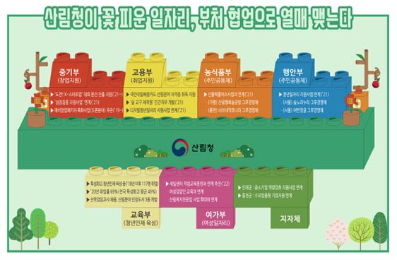 산림청은 중소벤처기업부·고용노동부·농식품부 등과 부처협업으로 청년 창업인 육성, 장애인일자리 확대, 사회적기업 집중 성장지원 등 민간분야 산림일자리 활성화를 위해 노력하고 있다.