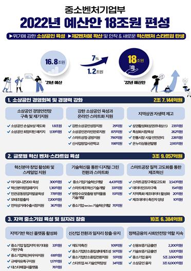 중소벤처기업부는 2022년도 예산안을 2021년 예산(16조 8,240억원) 대비 1조 1,807억원 증액(7%)한 18조원으로 편성하고 9월 3일 국회에 제출할 예정이라고 발표했다.