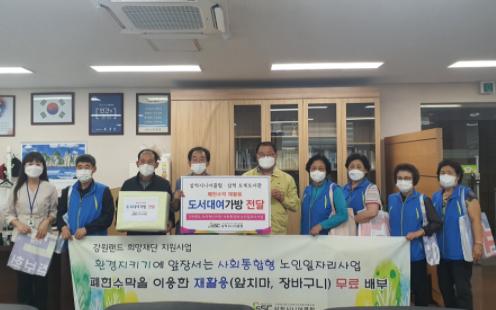 삼척시니어클럽회은 ‘강원랜드 희망재단 지원사업의 사회통합형 노인일자리 사업’의 일환으로 폐현수막을 이용한 도서용 가방 50점을 도계읍행정복지센터 도계도서관에 기증했다.
