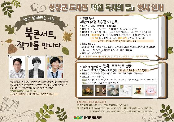 횡성군립도서관은 9월 독서의 달을 맞아 독서 의욕 고취 및 독서 생활화 장려를 위해‘독후감 이벤트, 집콕 비대면 프로그램 2탄, 북콘서트’등 다채로운 행사를 마련하였다고 밝혔다.