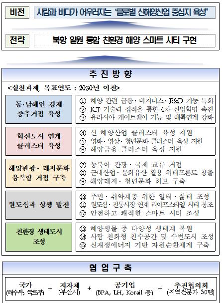 ‘부산항 북항 통합개발 2030’은 부산항 북항 일원 통합개발을 위한 기본구상으로, 시민단체, 학계, 지역전문가 등과의 협의를 거쳐 지난 2017년 12월 확정된 바 있다. 기본구상은 ‘사람과 바다가 어우러지는 글로벌 신해양산업 중심지 육성’이라는 비전 아래 부산항 북항 일원을 친환경 해양 스마트시티로 개발하는 전략을 담고 있다.