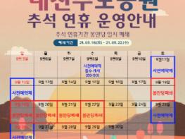 대전시설관리공단 추모공원에서는 지난 설 연휴에 이어 이번 추석 연휴(9월 18일 ~ 22일)에도 코로나19 확산 방지를 위하여 실내 봉안당을 개방하지 않는다고 밝혔다.
