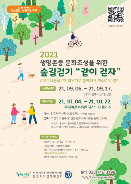 원주시 정신건강복지센터 부설 원주시 자살예방센터는 비대면 정신건강 생명사랑 축제의 하나로 오는 10월 4일부터 22일까지 생명존중 문화조성을 위한 숲길 걷기 ‘같이 걷자’를 진행한다.