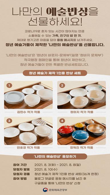 ‘나만의 예술반상’은 청년예술인이 1인용 반상 세트를 직접 제작해 응원 메시지와 함께 선물하는 사업이다. 이 사업은 청년예술인들의 작품 인지도를 높이고, 나만의 예술작품을 선물 받는 특별한 경험으로 문화가 주는 위로를 전달하기 위해 기획됐다. 지난 8월, 문체부는 블로그를 통해 가족이나 친구에게 따뜻한 밥 한 끼를 챙기고 싶어 하는 누리꾼들의 응원 사연을 받아 청년예술인 4인이 제작한 반상 세트 4종을 선물했다.