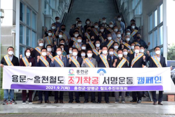 홍천군 범군민추진위원회는 양평군 철도추진위원회와 공동으로 9월 7일 양평군 용문역에서 용문~홍천철도 조기착공을 위한 서명운동 캠페인을 전개하였다.