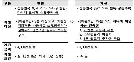 아울러, 주거시설 특성 상 사업추진 시 구분 소유자 동의 등 불편을 최소화하기 위하여 기존 건축물 단위 지원에서 세대 단위 지원으로 변경된다.