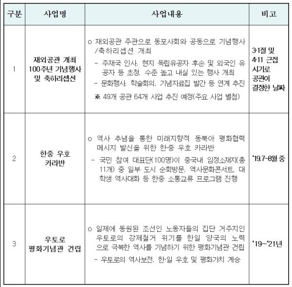 외교부는 올해 3·1운동 및 대한민국임시정부수립 100주년을 맞아 전 세계 740만 재외동포들과 함께 재외공관 개최 100주년 기념행사 및 축하리셉션, 한중 우호 카라반, 우토로 평화기념관 건립 등 다양한 사업을 추진한다.