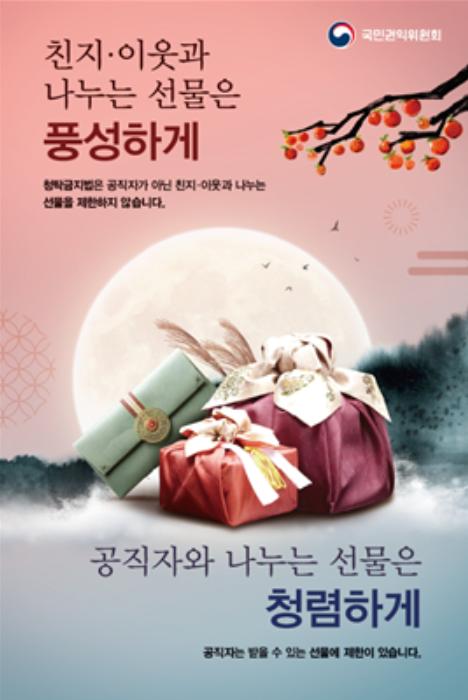 국민권익위 전현희 위원장은 “이번 추석에는 국민 모두가 청탁금지법을 바로 알고 친지, 고마운 분들께 방문하지 못하는 아쉬운 마음을 우리 농수산물 선물로 대신 전했으면 좋겠다.”라며, “코로나19로 힘든 상황이지만 함께 나누는 정을 통해 풍성한 한가위를 맞이할 수 있길 바란다.”라고 말했다.