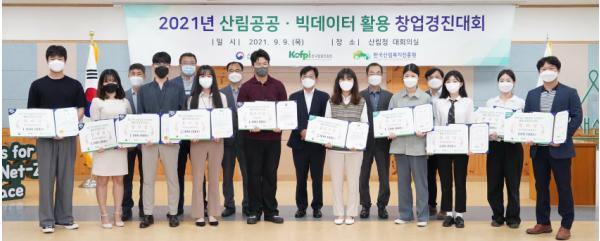 산림청은 한국임업진흥원, 한국산림복지진흥원과 함께 진행한 ‘2021년 산림공공·빅데이터 활용 창업경진대회’ 시상식을 9일 정부대전청사 17층 대회의실에서 개최했다.