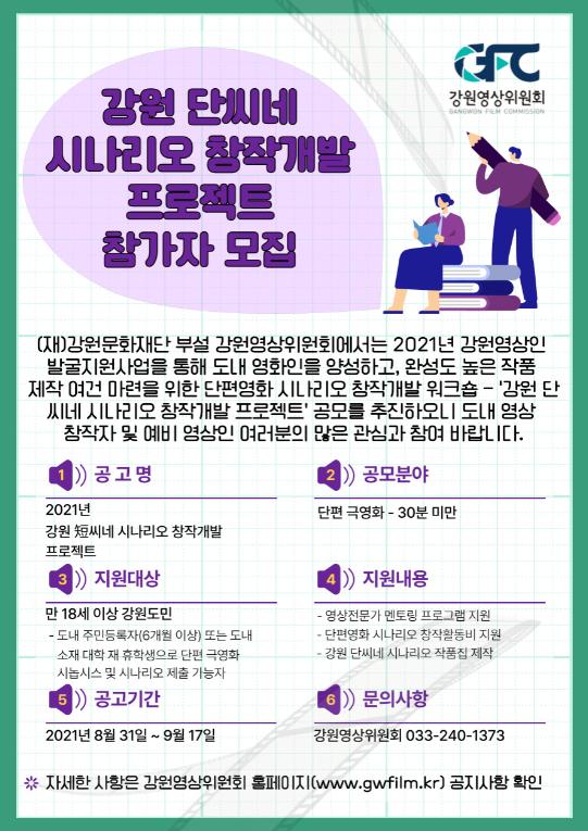 강원영상위원회는 2021년 강원영상인 발굴·지원사업인 ‘강원 短(짧을 단)씨네 시나리오 창작개발 프로젝트’ 참가자를 9월 10일부터 9월 17일까지 모집한다.