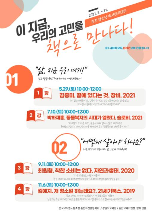 춘천‧화천 지역 중고생 독서동아리 연합활동인 ‘청소년독서아카데미’는 △1학기, “삶, 지금 우리 여기!”, △2학기, “어떻게 살아야 하나요?” 라는 주제로 4회에 걸쳐 온라인으로 진행하고 있으며, 이번에는 기후 위기의 현실과 삶의 방향에 대해 함께 고민하는 시간을 마련했다.