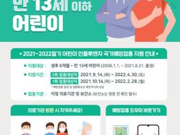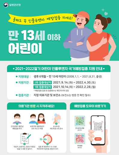어린이 인플루엔자 접종의 경우 생애 첫 접종을 하는 생후 6개월에서 만 9세 미만 어린이는 2회 접종(4주 간격)을, 과거 2회 접종력이 있는 어린이는 1회 접종을 지원한다.