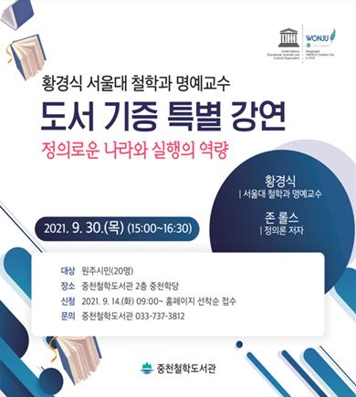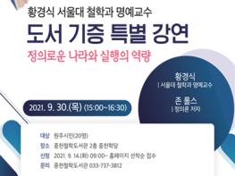 중천철학도서관이 원주시에 희귀 서양 철학도서 5,070권을 기증한 황경식 서울대 철학과 명예교수를 초청해 특별 강연을 듣는 시간을 마련한다.