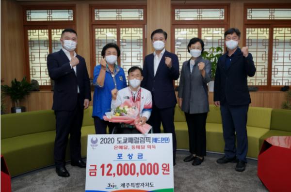 제주특별자치도가 제주도청 직장운동경기부(장애인부) 창단 이래 패럴림픽에서 최초 메달을 획득한 이동섭 선수에게 포상금을 지급하고 격려했다.