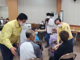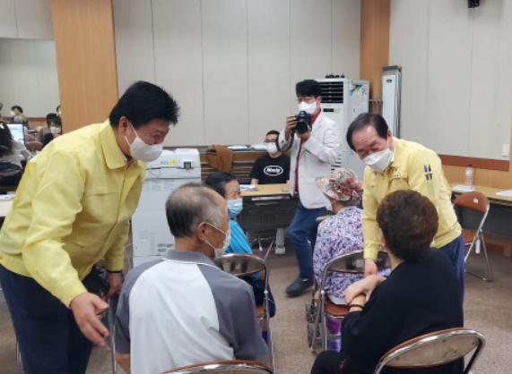 평창군은 한왕기 군수가 14일 읍면 코로나 상생 국민지원금 지급 현장을 찾아 직원들을 격려하고 코로나로 지친 주민들을 위로하고 있다.
