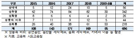 비위 유형별로는 성추행 342건 성희롱 218건 성매매 56건, 성풍속 비위가 44건 성폭행 26건 순으로 집계됐으며, 전체 686건 중 60%에 달하는 398건이 학생을 대상으로 일어났다.