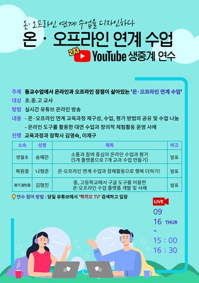 강원도교육청은 16일 오후 3시부터 4시 30분까지, 도내 초·중·고 교사를 대상으로 유튜브 채널 ‘학끼오TV’를 통해 ‘온·오프라인 연계 수업’ 연수를 온라인 생방송으로 진행한다.