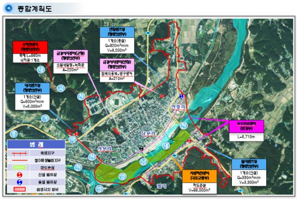 2022년부터 2025년까지 4년간 추진되는 이번사업은 소하천(내곡천)정비 1개소, 침수지역 우수관거 정비 2개소(월리, 서문·남문리), 배수펌프장 신․증설 3개소(월리, 내곡리, 연창리) 급경사지 정비 2개소(연창리, 군행리) 등이 이뤄지게 된다.