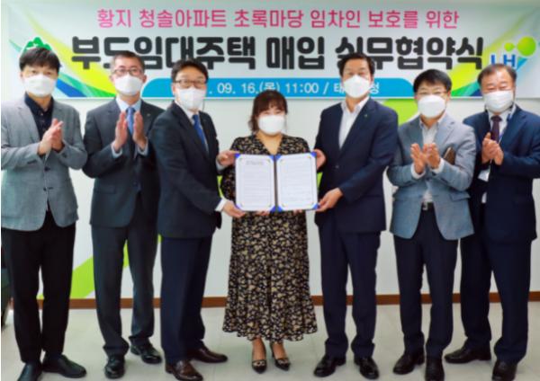 태백시와 LH강원지역본부는 16일 태백시청 집무실에서 ‘청솔아파트 임차인 보호를 위한 매입 협약’을 체결했다.
