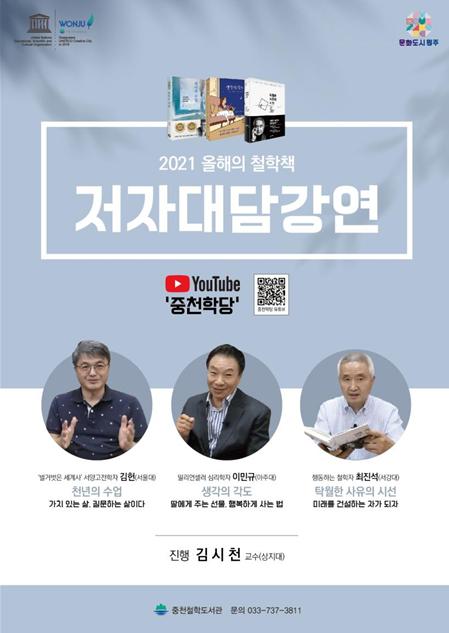 원주시 중천철학도서관은 최근 2021년 올해의 철학책 선정 도서 저자 3명을 초청해 대담강연을 진행하고 현재 유튜브 채널 ‘중천학당’을 통해 총 6편을 온라인으로 볼 수 있도록 제공 중이라고 밝혔다.
